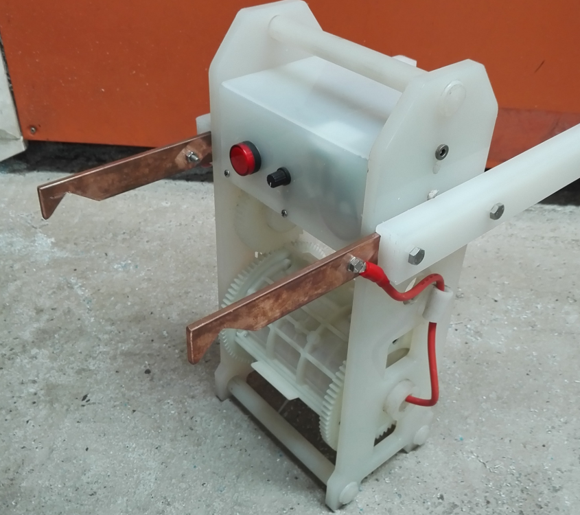①一般为一体式即下面为转动滚筒,上面为传动部分和导电钩子;此种制作一般承载重量不是很重的情况下(介于②和③之间的重量)