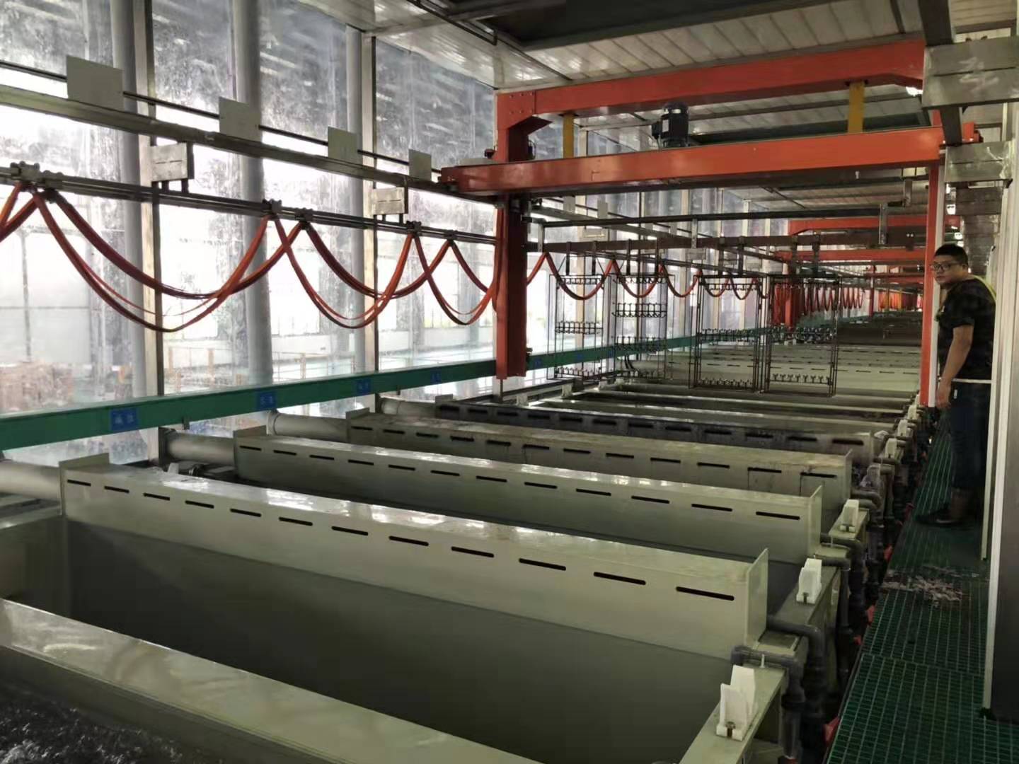 电镀处理过程中所用的设备主要有各类固定槽、滚镀槽、挂具、吊篮等。镀后处理是对零件进行抛光、出光、钝化、着色、干燥、封闭、去氢等工作,龙门式挂镀生产线,根据需要选用其中一种或数种工序使零件符合质量要求。镀后处理常用设备主要有磨、抛光机,各类固定槽。