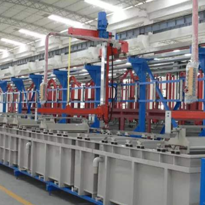 电镀处理过程中所用的设备主要有各类固定槽、滚镀槽、挂具、吊篮等。镀后处理是对零件进行抛光、出光、钝化、着色、干燥、封闭、去氢等工作,龙门式挂镀生产线,根据需要选用其中一种或数种工序使零件符合质量要求。镀后处理常用设备主要有磨、抛光机,各类固定槽。